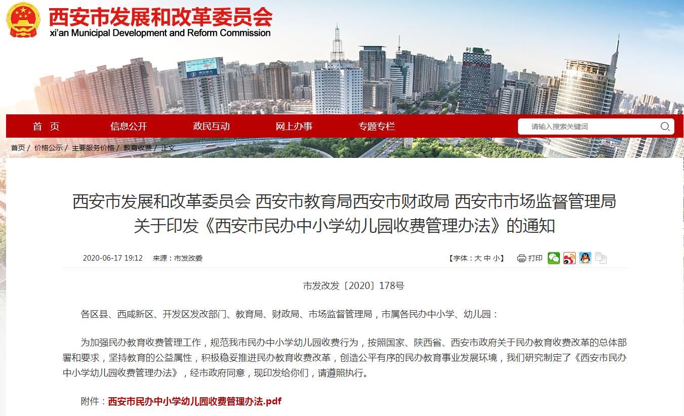 人民网西安6月18日电 (左瑞)近日,西安市发展和改革委员会官方网站发布了《西安市民办中小学幼儿园收费管理办法》(以下简称《办法》),并公布了一、二、三类民办中小学学费价格。其中,一类收费标准小学不超过 8000 元/生·学期;初中不超过10000 元/生·学期;高中不超过 11000 元/生·学期。