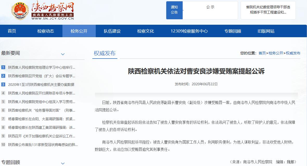 人民网西安6月23日电 据陕西检察网消息,日前,陕西省商洛市丹凤县人民政府原副县长曹安良(副处级)涉嫌受贿罪一案,由商洛市人民检察院向商洛市中级人民法院提起公诉。 检察机关在审查起诉阶段依法告知了被告人曹安良享有的诉讼权利,依法讯问了被告人,听取了辩护人的意见,依法保障了被告人的各项诉讼权利。