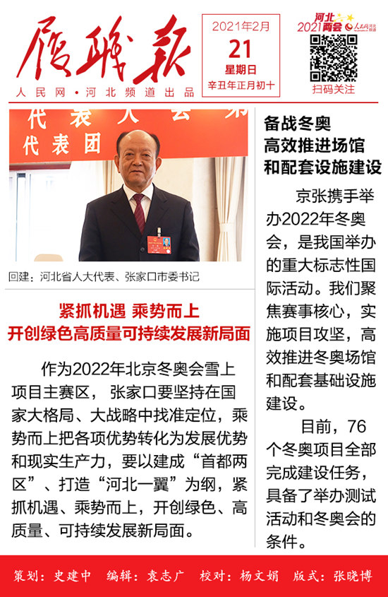 2021河北两会《履职报》系列报道之四 回建:紧抓机遇 乘势而上 开创绿色高质量可持续发展新局面 相关阅读: 【履职报】张涛:奋斗正当时 打造宜居宜业宜游宜乐的美丽定州 【履职报】王昌丰:筑牢国门安全防线 助推河北高质量发展 【履职报】郭旭涛:团聚青力主动作为 新征程上砥砺奋进贡献青春力量 【履职报】高云霄:坚定信心决心 全力推动高质量财政建设再上新台阶 【履职报】杨勇:为建设高质量教育体系开好局起好步 【履职报】丁锦霞:顺“市”而为 大力推进市场治理体系和治理能力现代化 重磅!人民网推出河北两会《履职报》系列报道.