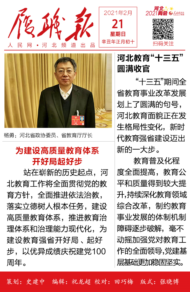 2021河北两会《履职报》系列报道之三 杨勇:为建设高质量教育体系开好局起好步 相关阅读: 【履职报】张涛:奋斗正当时 打造宜居宜业宜游宜乐的美丽定州 【履职报】王昌丰:筑牢国门安全防线 助推河北高质量发展 【履职报】郭旭涛:团聚青力主动作为 新征程上砥砺奋进贡献青春力量 【履职报】高云霄:坚定信心决心 全力推动高质量财政建设再上新台阶 【履职报】回建:紧抓机遇 乘势而上 开创绿色高质量可持续发展新局面 【履职报】丁锦霞:顺“市”而为 大力推进市场治理体系和治理能力现代化 重磅!人民网推出河北两会《履职报》系列报道.